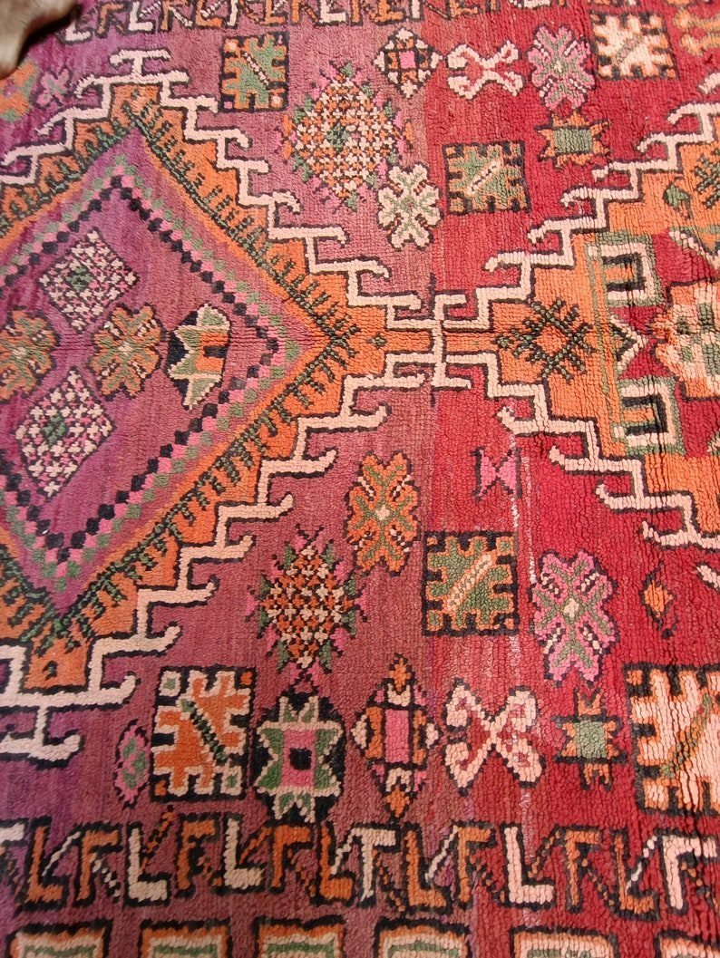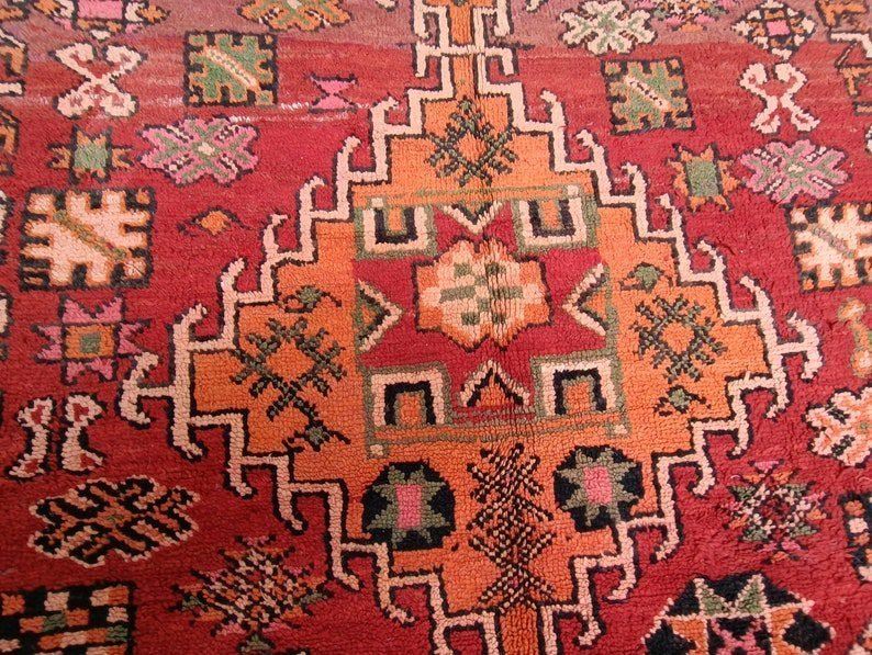 This incredible 1970s Moroccan traditional Berber vintage carpet is 100% handmade by the Atlas mountains artist Berber women, along with this amazing colorful vintage look design that is wonderful. Bold geometric prints and Berber symbols will bring serenity and character to your interiors.
