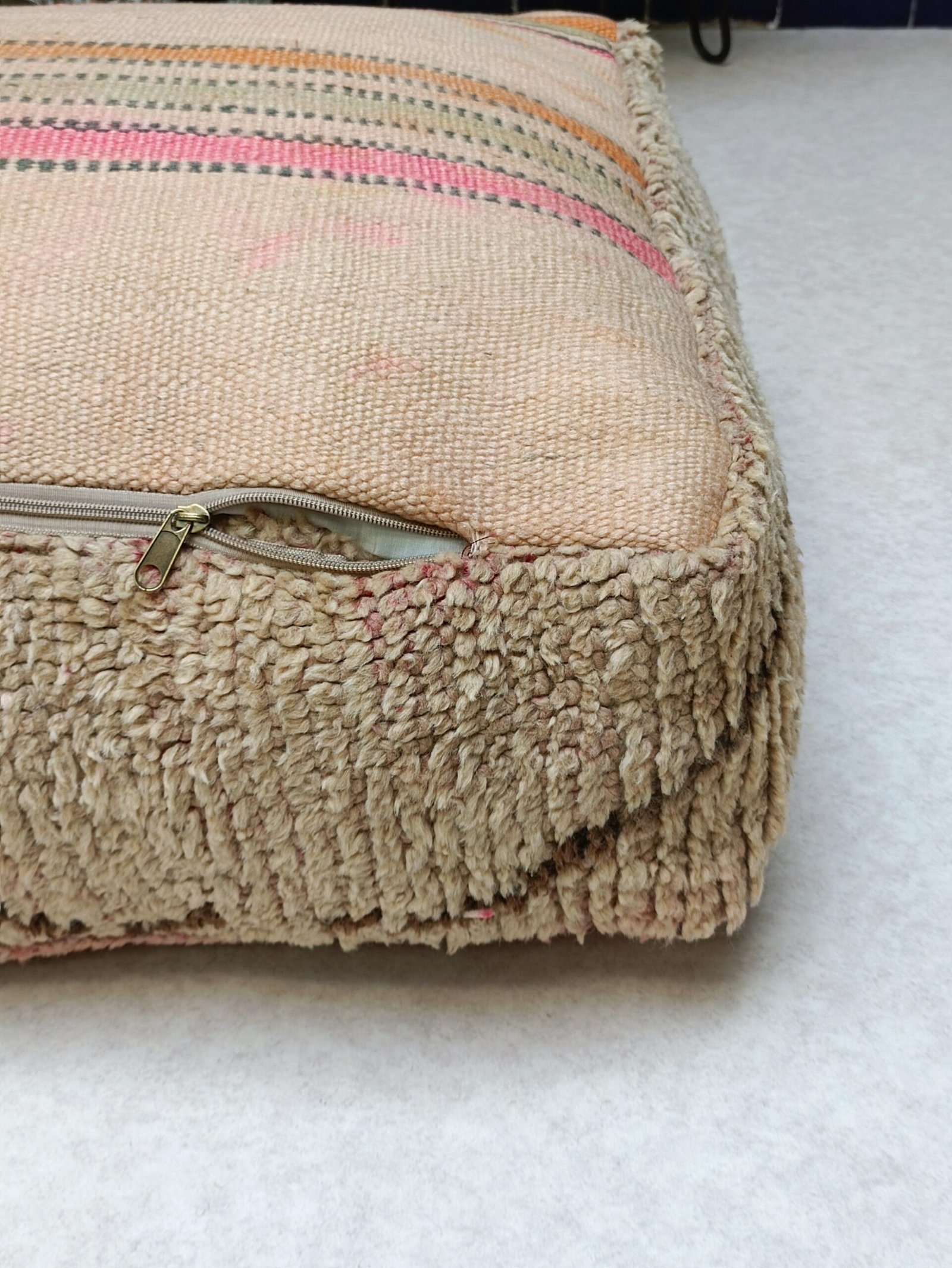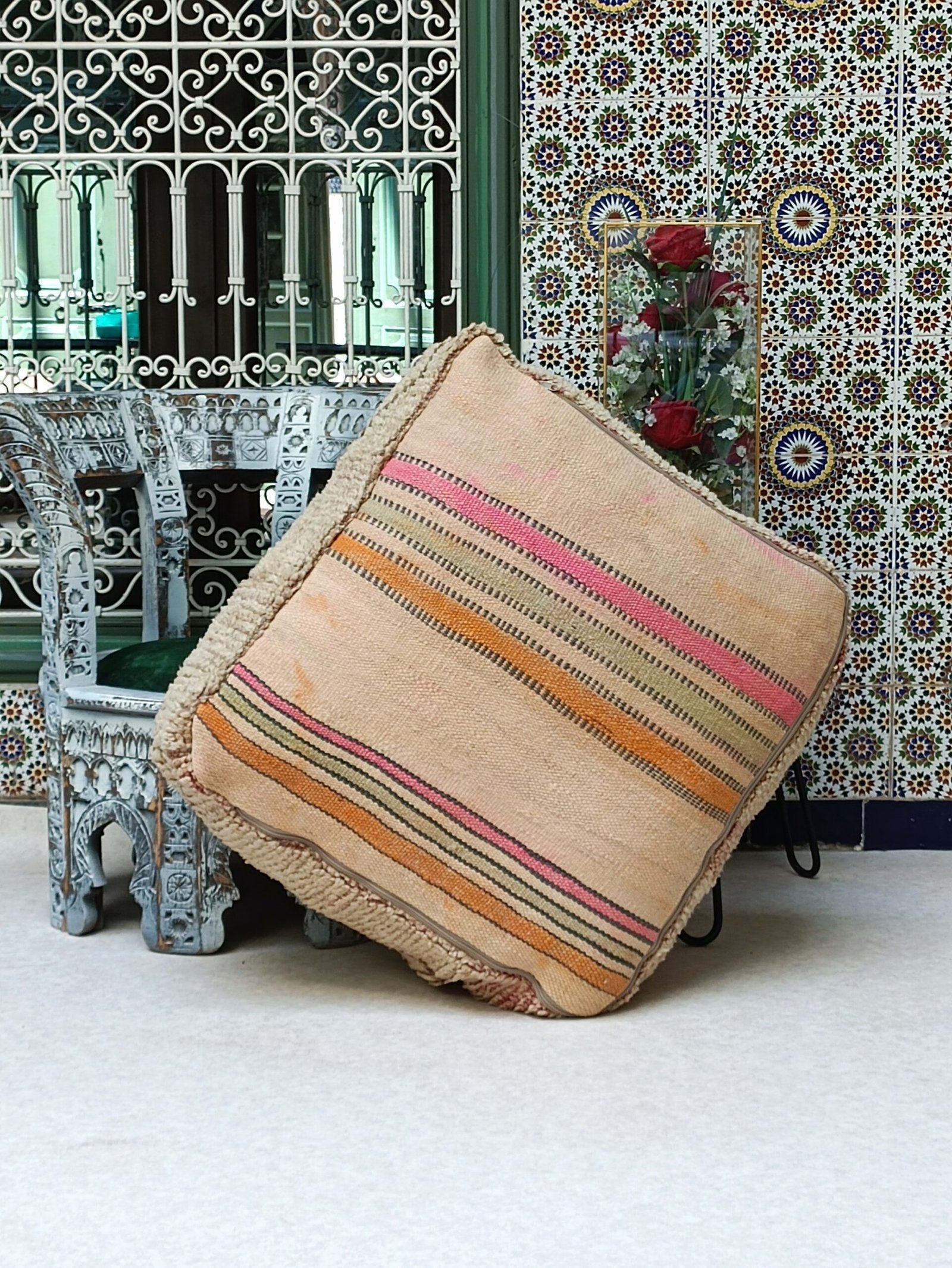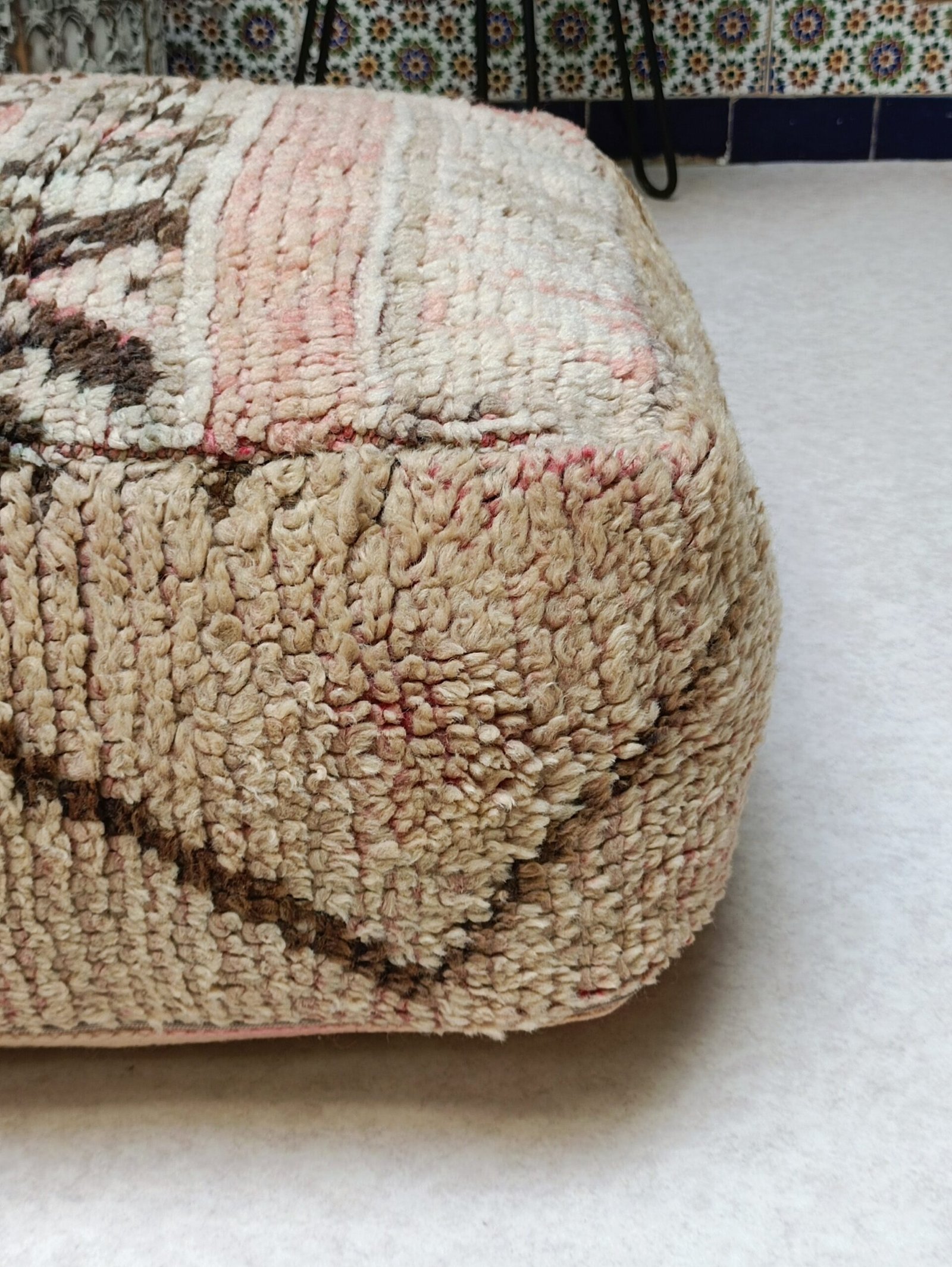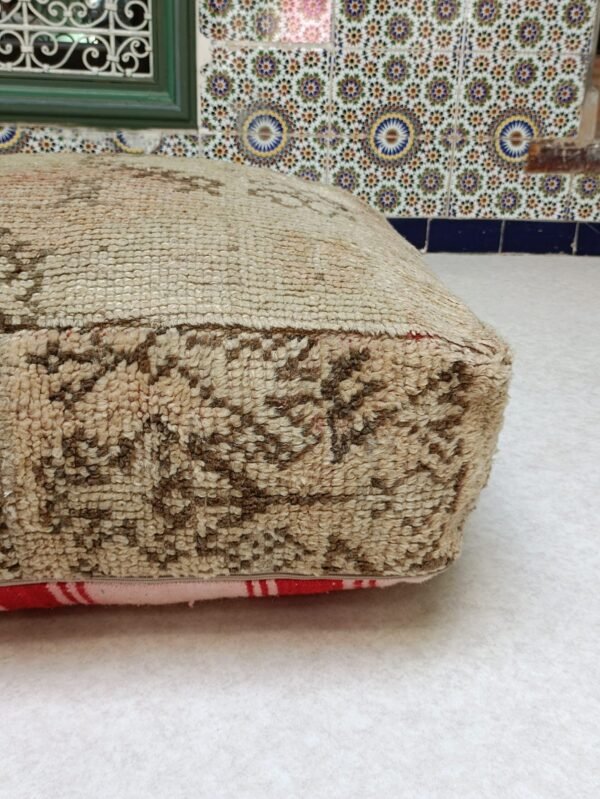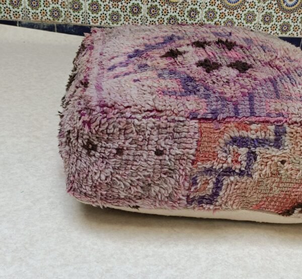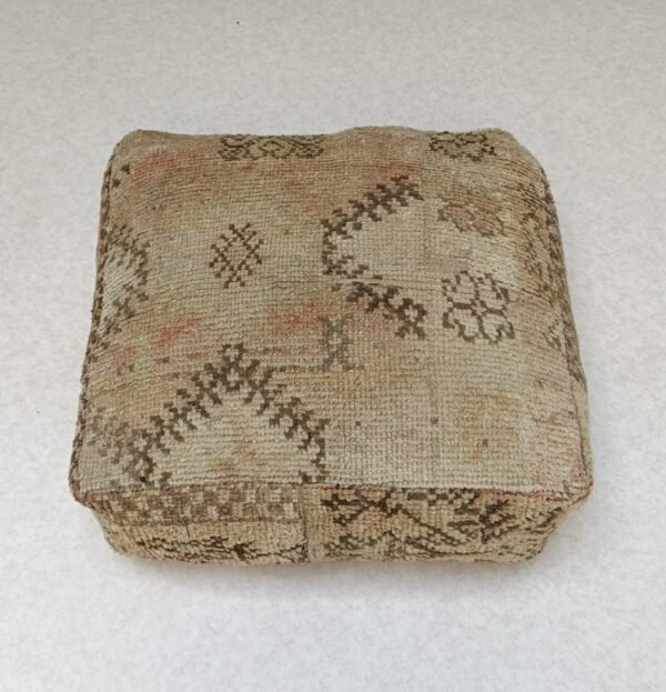 This one-of-a-kind Moroccan Pouf is handcrafted by using vintage kilim / Beni ourain / Beni mellal rugs from Morocco. Each Moroccan Pouf kilim is distinct and unique and with a Berber symbol, each symbol has a meaning that tells stories The themes are all inspired by tribal life such as birth, motherhood, marriage .
