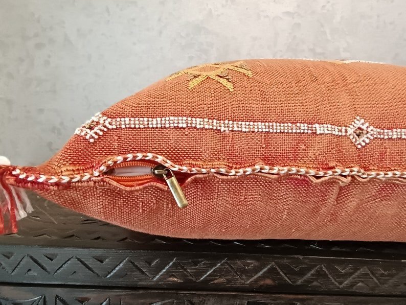 This cactus silk pillow, Decorative Moroccan Berber Cushion Sabra Cactus, was handwoven from silk from the Sabra Cactus plant. Local villagers harvest the leaves of the Sabra cactus plant for the filaments within, and loom the textural of ancient motifs with special berber symbols, and each pillow cover gets its almost unique. With their Berber patterns and colors, they will be perfect for warming up your interior and giving it a chic ethnic touch.