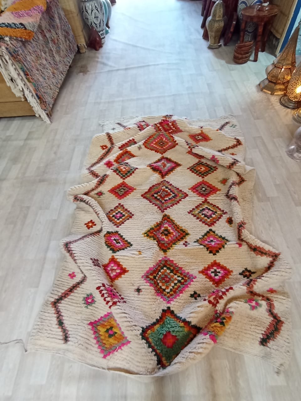 Woven with soft natural wool, the rug offers a perfect balance of Moroccan heritage and contemporary charm. Whether placed in a living room, bedroom, or reading nook, it brings soul, color, and texture to any interior.