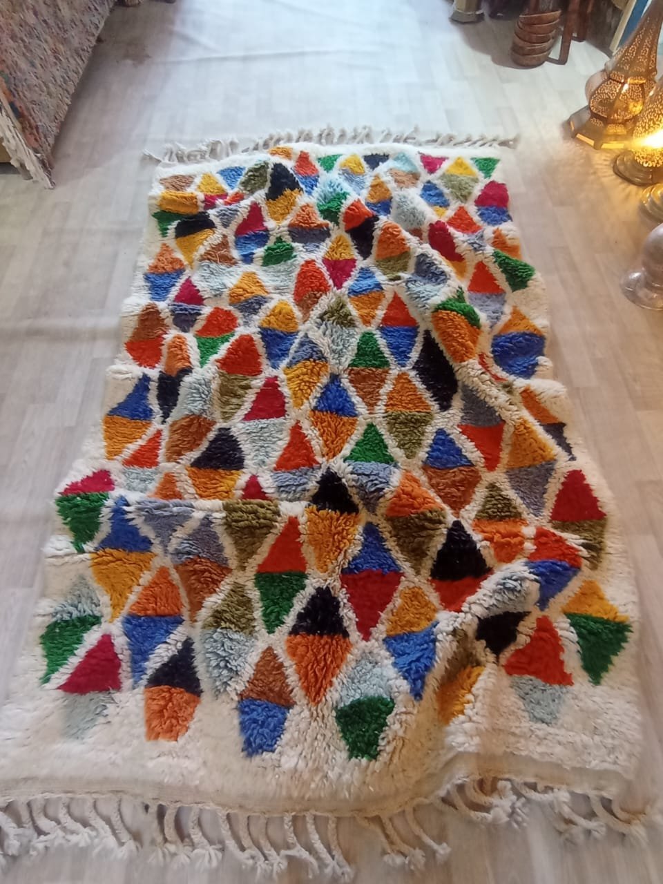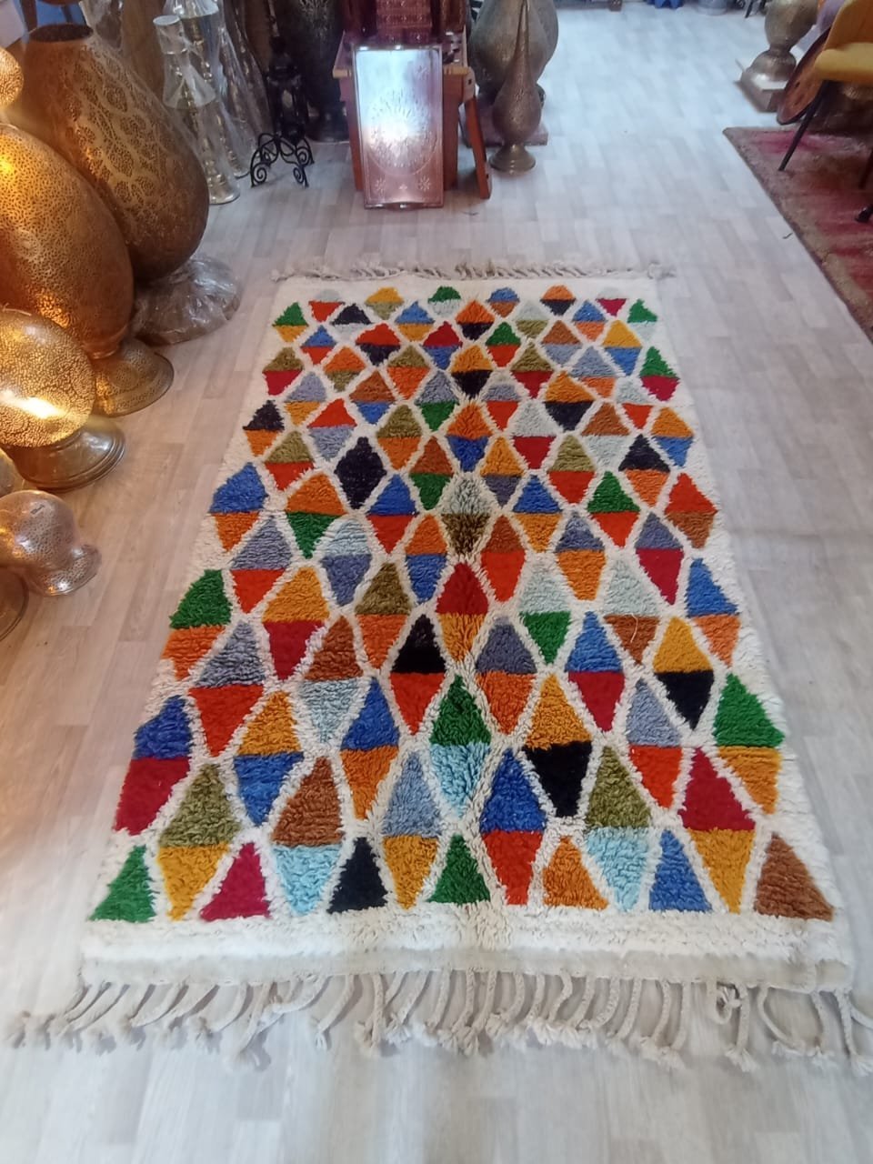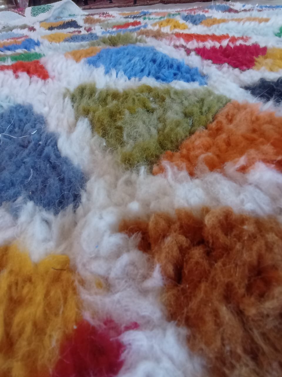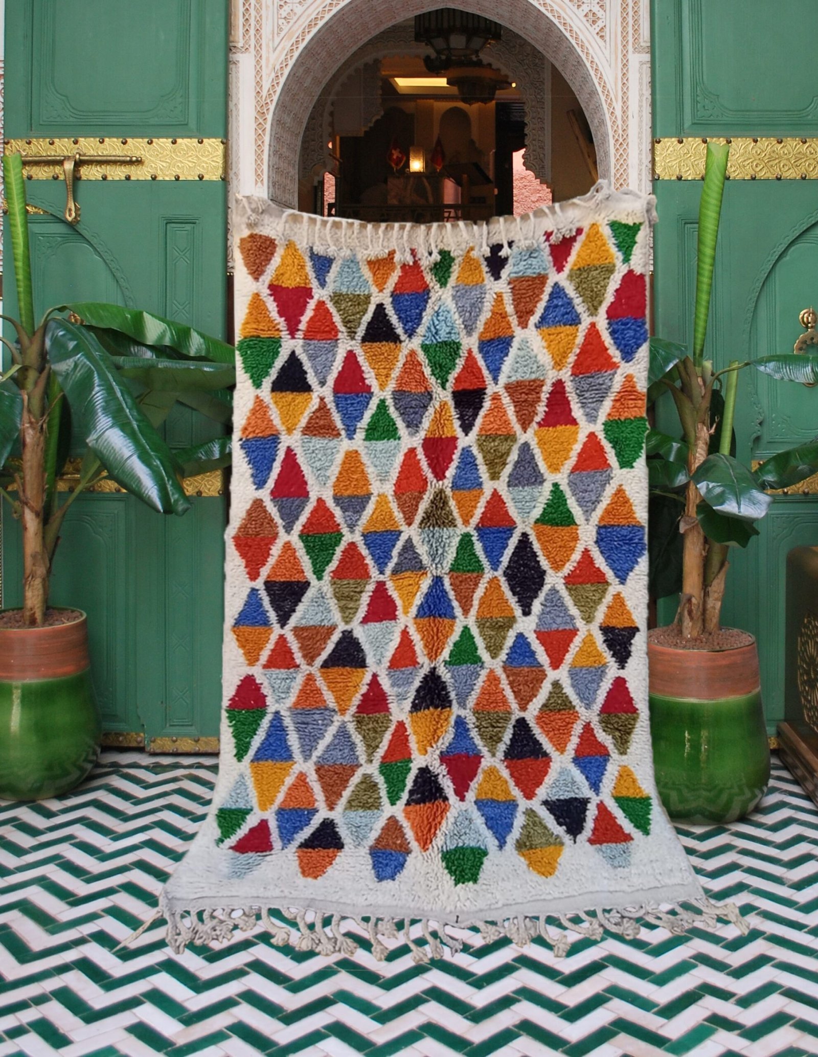 Handwoven in the heart of Morocco, this authentic Azilal rug blends bold color with timeless tribal artistry. Crafted from 100% natural wool by skilled Berber artisans, it features vibrant geometric patterns that energize and warm any interior. The rich, lively palette makes this rug a perfect centerpiece for living rooms, bedrooms, or creative spaces.