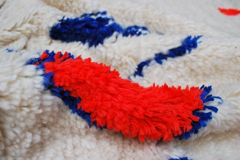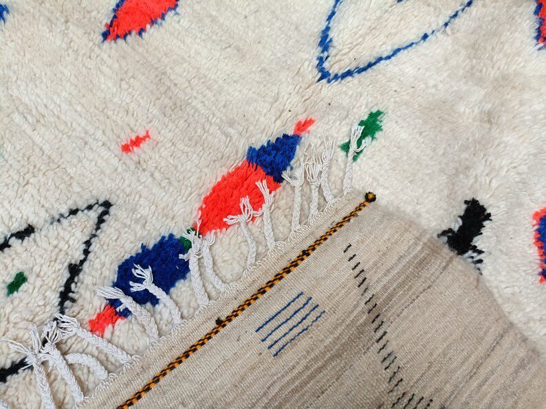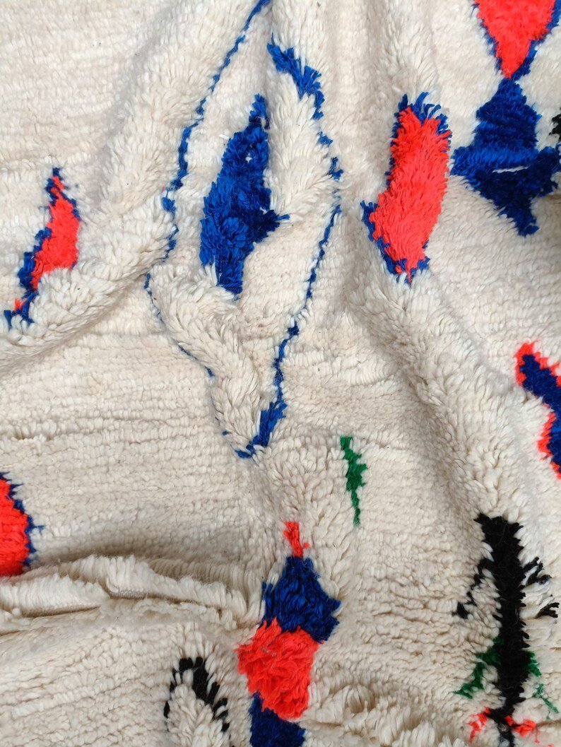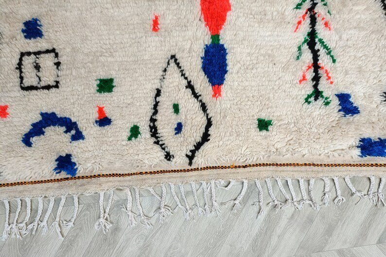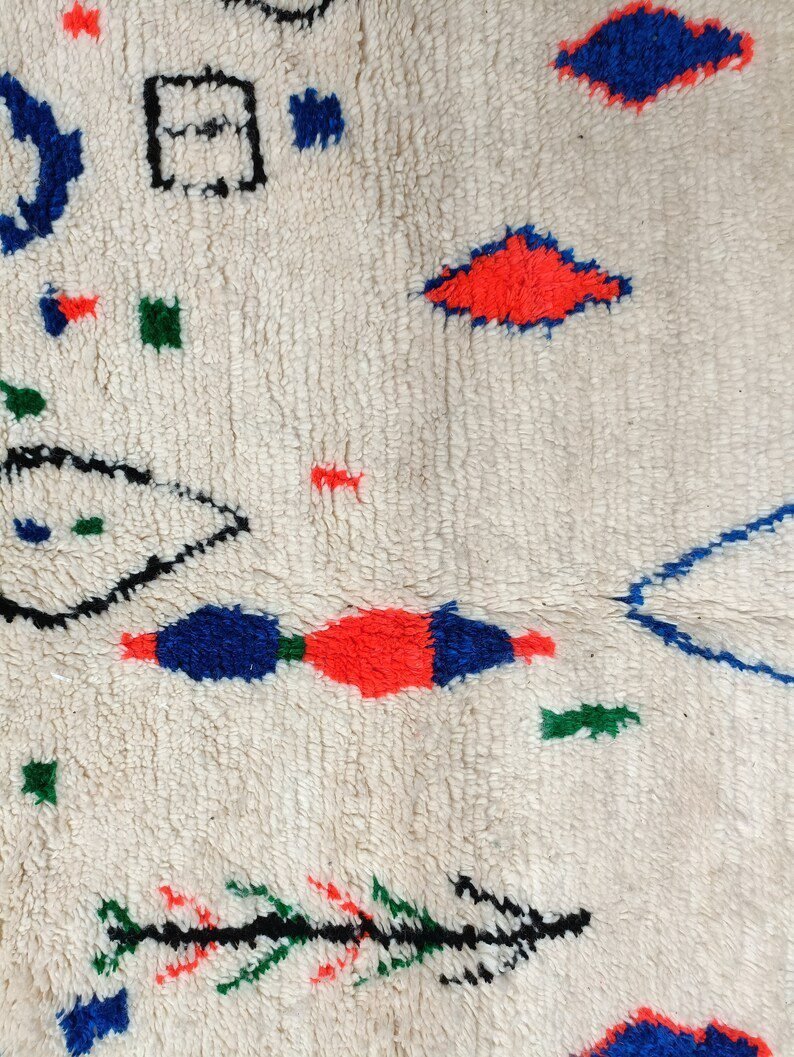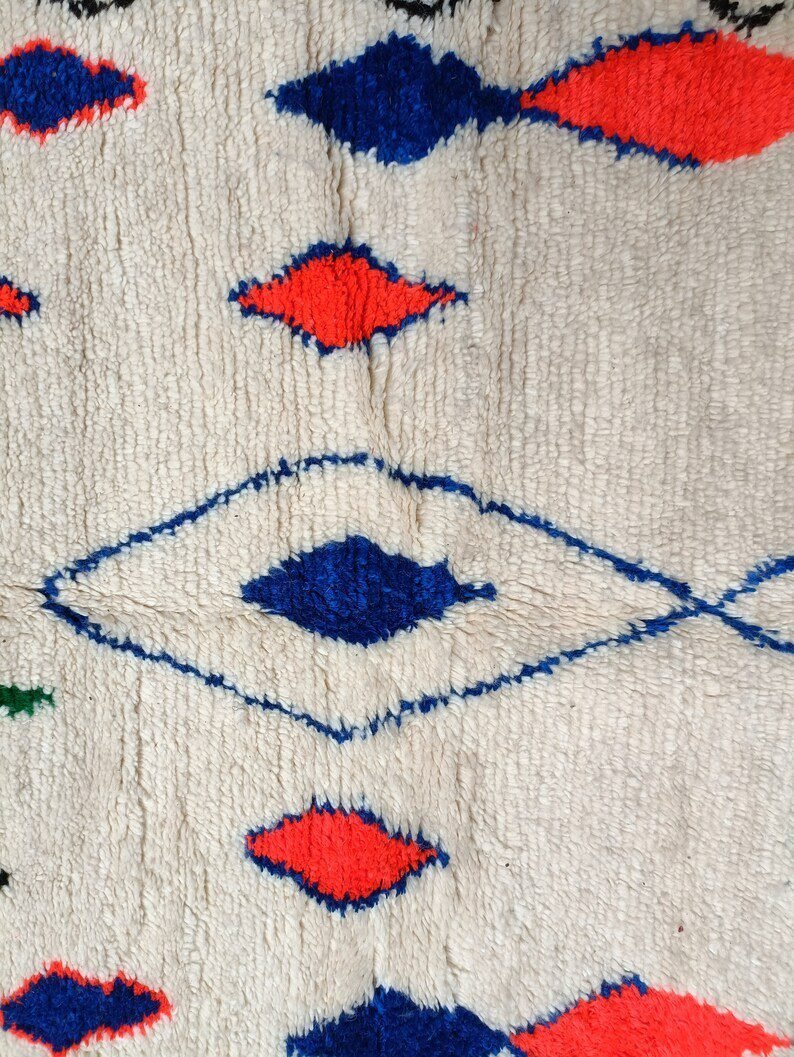 Azilal rugs are works of art weaved traditional weaving looms which every rural Berber woman in the Atlas Mountains in Morocco tells her story. The themes are all inspired by tribal life such as birth, motherhood, marriage and even farming imagined by the weaver who made it, it is a skillful balance between weaving and knotting that allows them to create unique rugs with vintage patterns and colors.