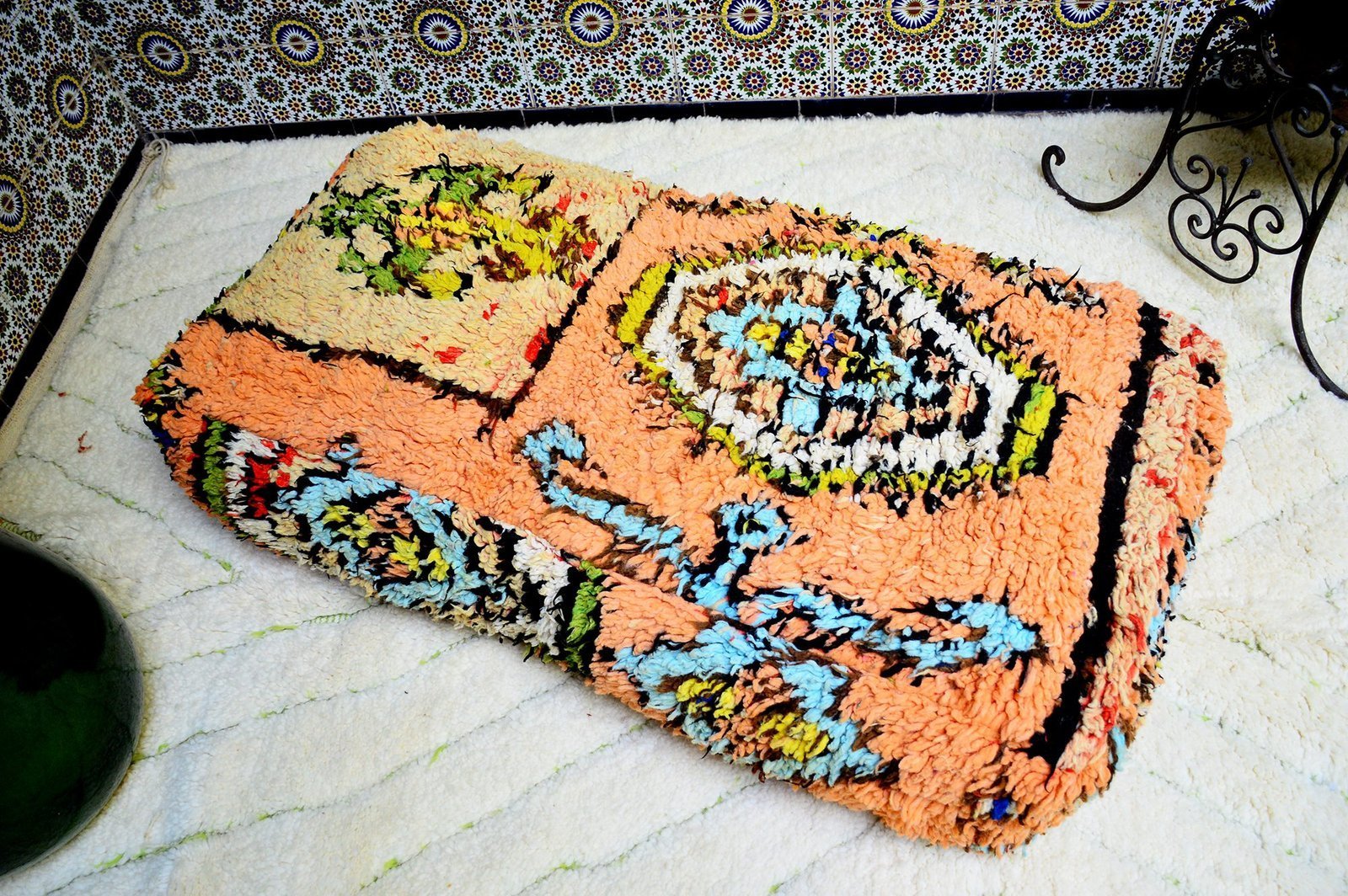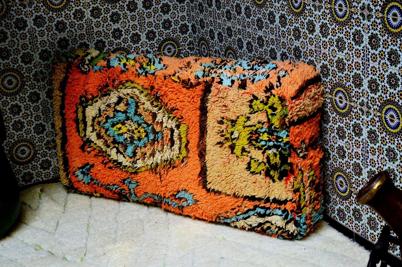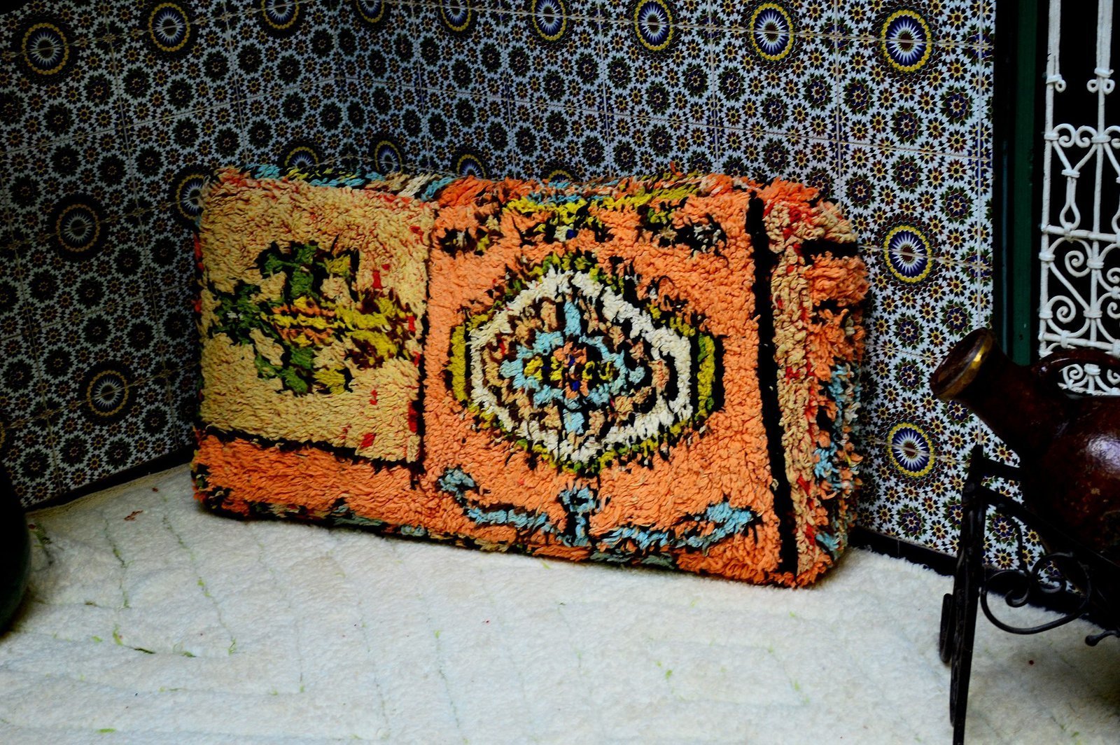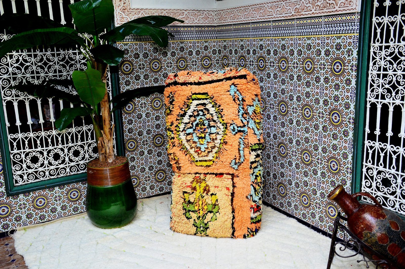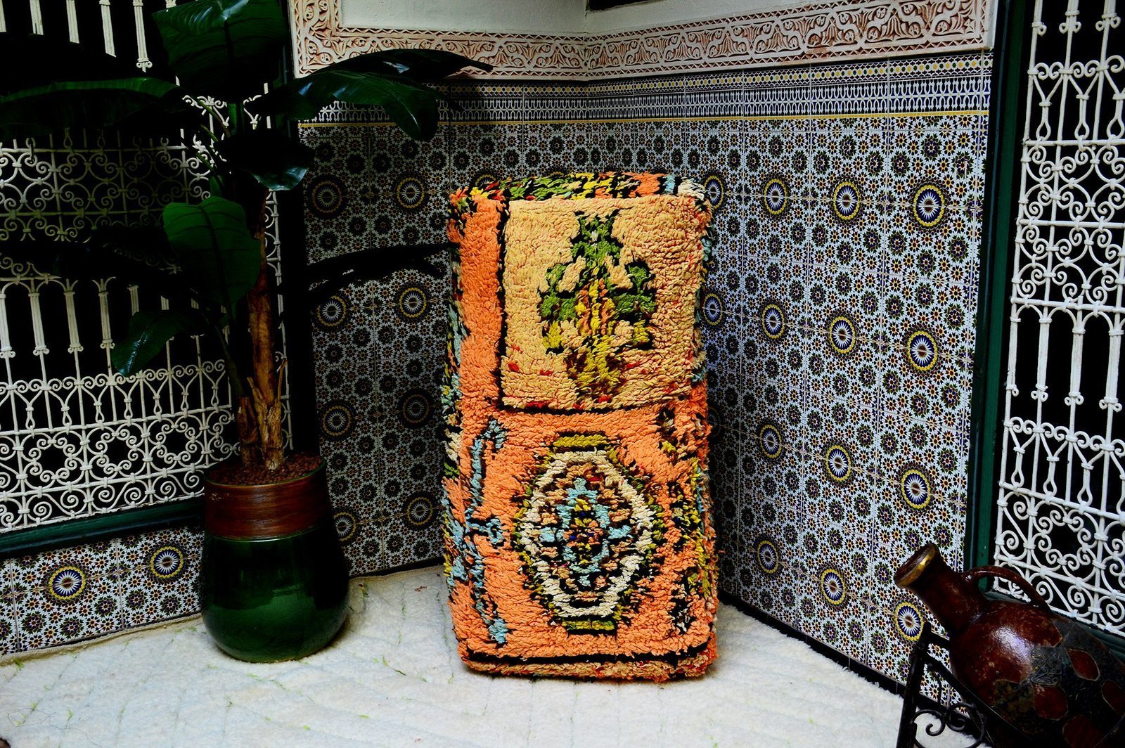 This one-of-a-kind Moroccan Pouf is handcrafted by using vintage kilim / Beni ourain / Beni mellal rugs from Morocco. Each Moroccan Pouf kilim is distinct and unique and with a Berber symbol, each symbol has a meaning that tells stories