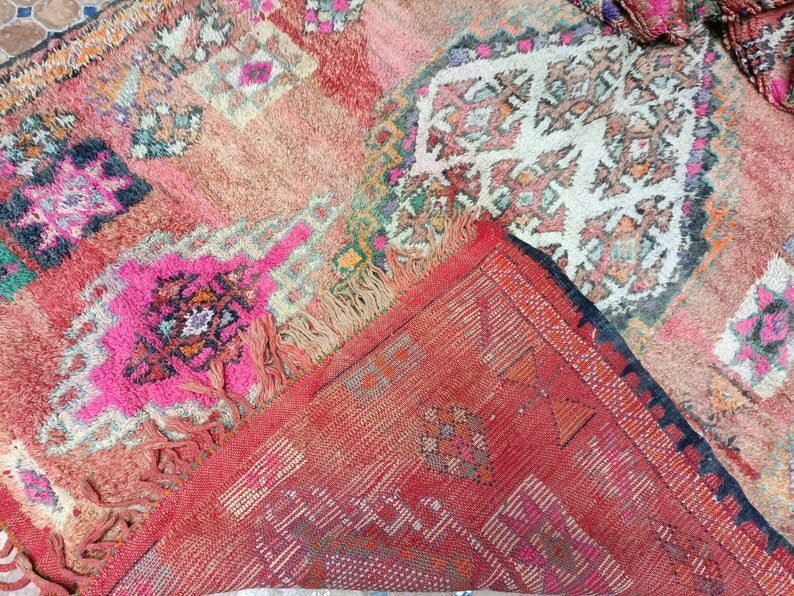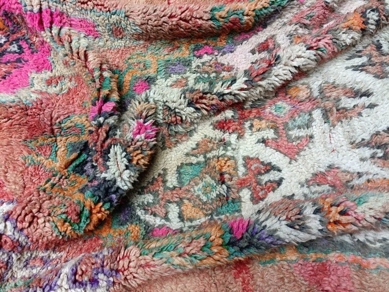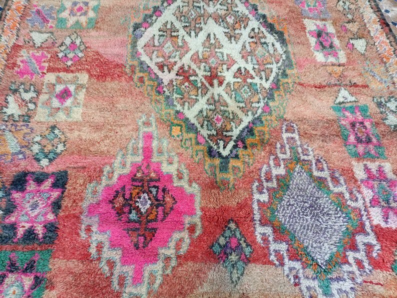 Magnificent vintage Moroccan Berber carpet and large Boujaad, handwoven in the Middle Atlas by Moroccan berber Women. They typically feature asymmetrical geometric patterns and orange, pink, vibrant blue, and Fuchsia color palettes.