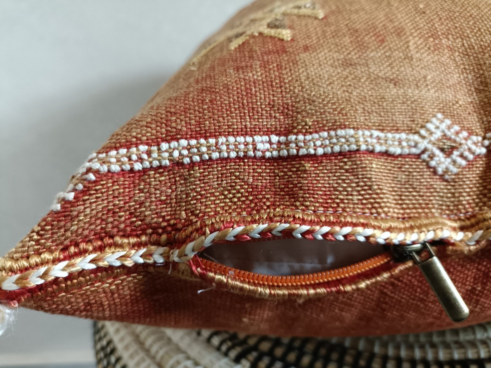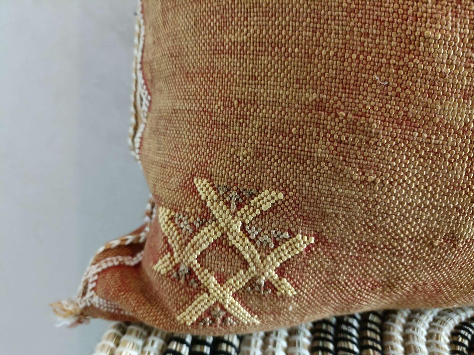 This cactus silk pillow, Decorative Moroccan Berber Cushion Sabra Cactus, was handwoven from silk from the Sabra Cactus plant. Local villagers harvest the leaves of the Sabra cactus plant for the filaments within, and loom the textural of ancient motifs with special berber symbols, and each pillow cover gets its almost unique. With their Berber patterns and colors, they will be perfect for warming up your interior and giving it a chic ethnic touch.