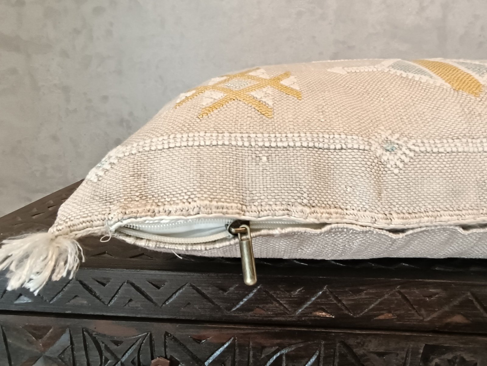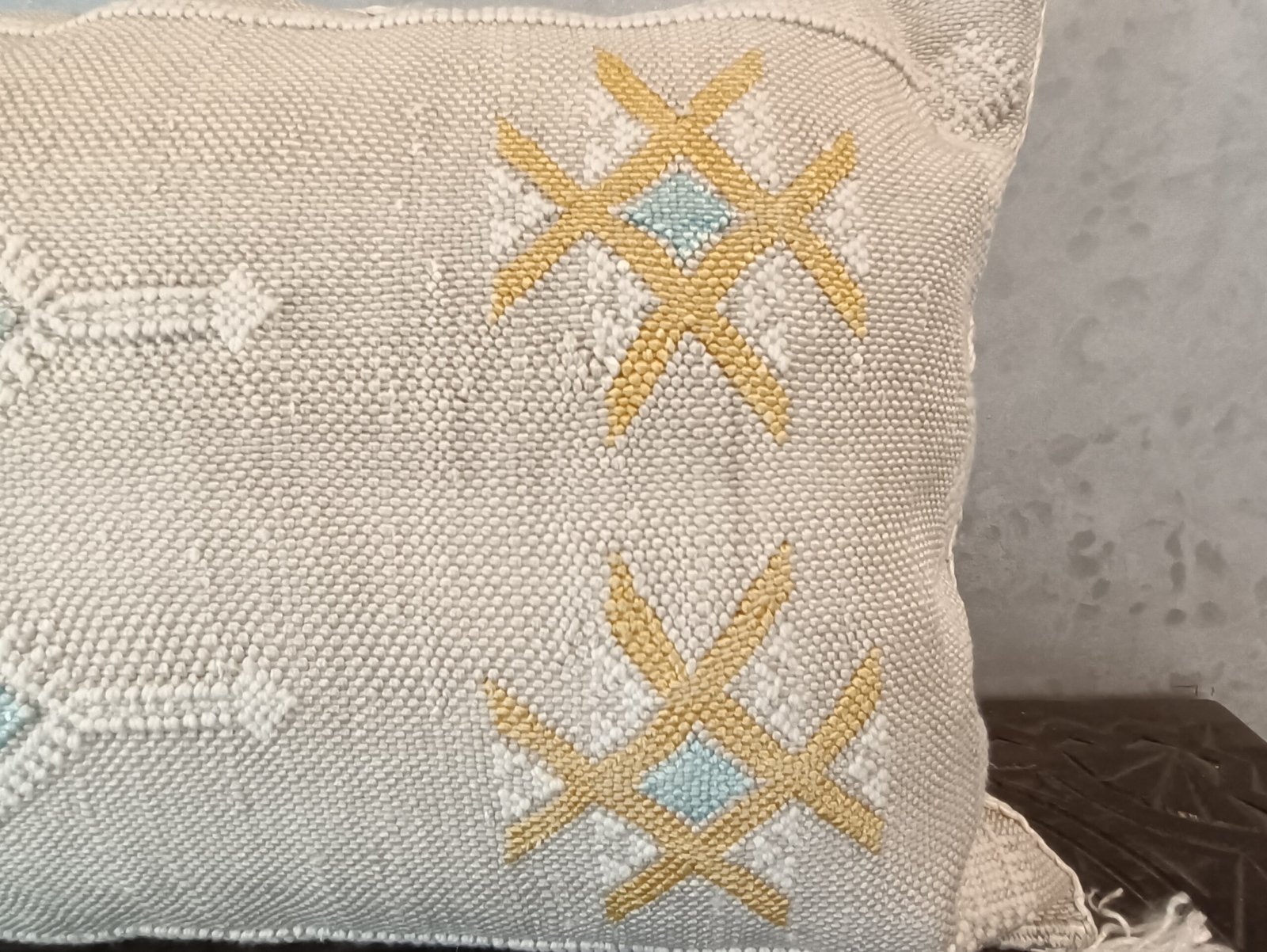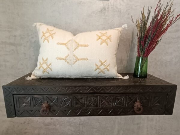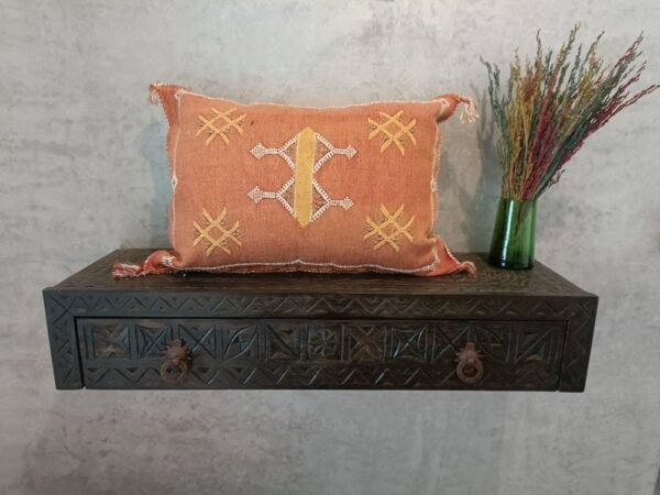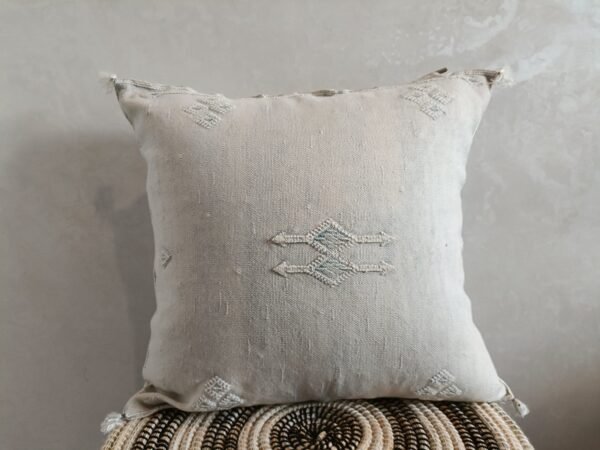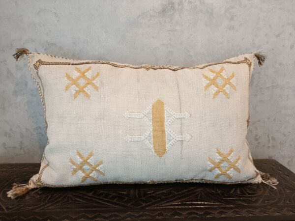 This cactus silk pillow, Decorative Moroccan Berber Cushion Sabra Cactus, was handwoven from silk from the Sabra Cactus plant. Local villagers harvest the leaves of the Sabra cactus plant for the filaments within, and loom the textural of ancient motifs with special berber symbols, and each pillow cover gets its almost unique. With their Berber patterns and colors, they will be perfect for warming up your interior and giving it a chic ethnic touch.