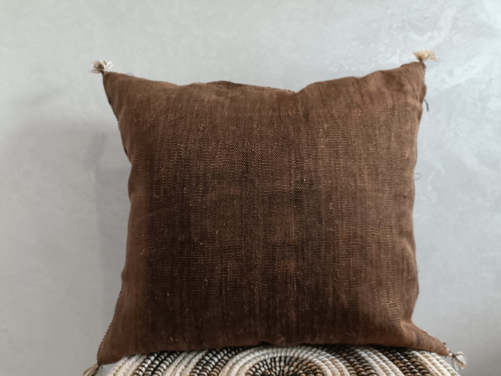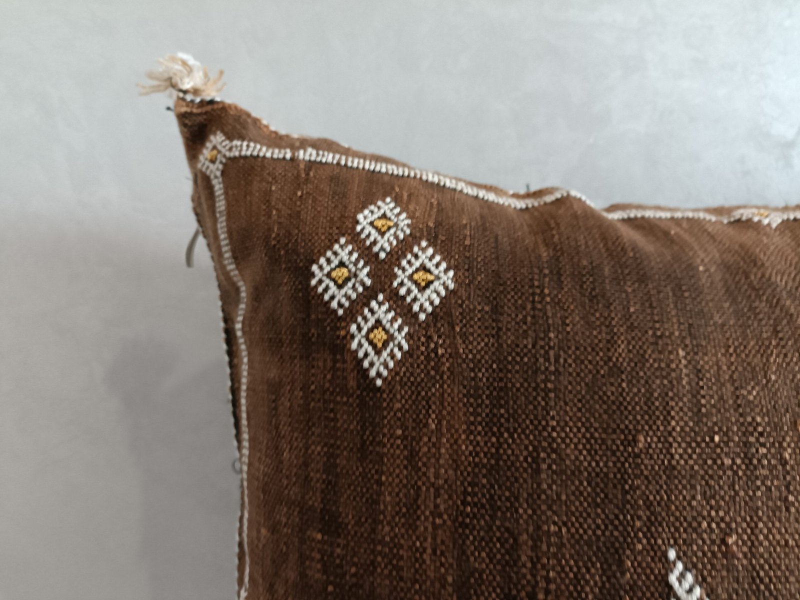 This cactus silk pillow, Decorative Moroccan Berber Cushion Sabra Cactus, was handwoven from silk from the Sabra Cactus plant. Local villagers harvest the leaves of the Sabra cactus plant for the filaments within, and loom the textural of ancient motifs with special berber symbols, and each pillow cover gets its almost unique. With their Berber patterns and colors, they will be perfect for warming up your interior and giving it a chic ethnic touch.