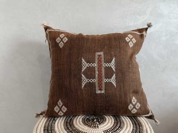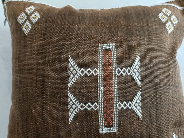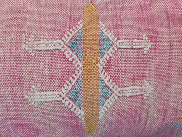 Authentic Moroccan Cactus Silk Pillow, hand woven by Berber women in their own homes. These skilled artisans will take at least a day to weave this pillow on traditional wooden looms, a craft that has been handed down from mother to daughter over many centuries. Following our own design, the motifs on the pillow cover reflect traditional symbols used by tribal women from Morocco’s Atlas Mountains.