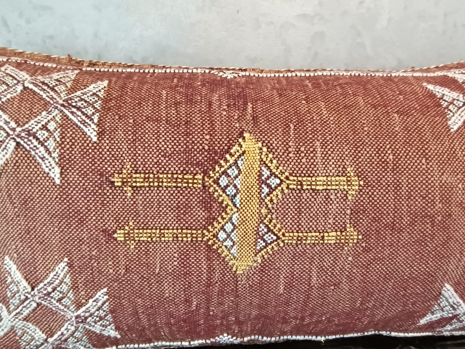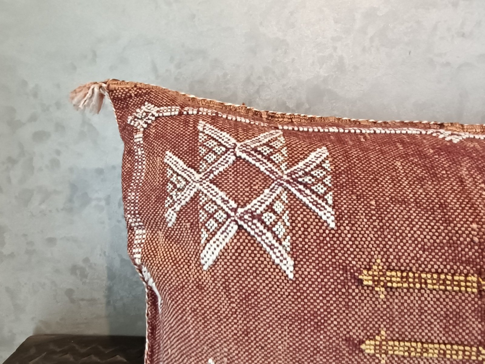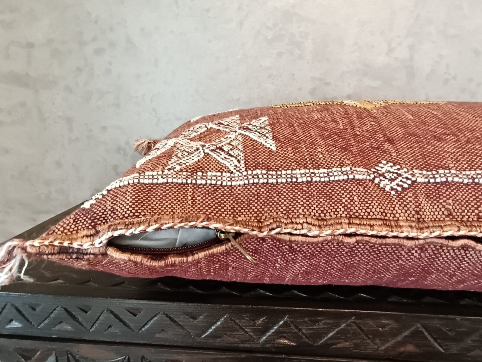 This cactus silk pillow, Decorative Moroccan Berber Cushion Sabra Cactus, was handwoven from silk from the Sabra Cactus plant. Local villagers harvest the leaves of the Sabra cactus plant for the filaments within, and loom the textural of ancient motifs with special berber symbols, and each pillow cover gets its almost unique. With their Berber patterns and colors, they will be perfect for warming up your interior and giving it a chic ethnic touch.
