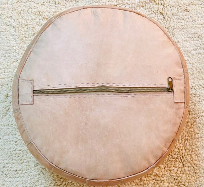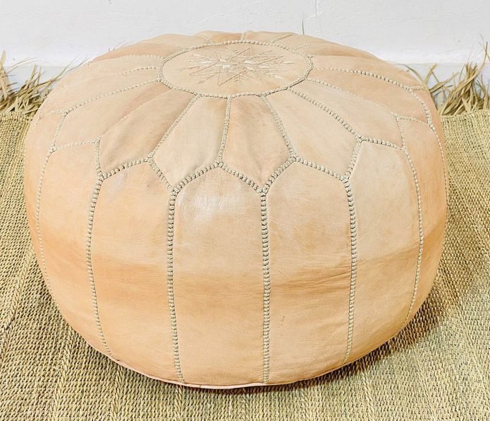 Our poufs are handmade from genuine leather by a cooperative of artisans from Morocco. Individual pieces of leather are dyed, stitched together and then decorated with intricate hand-sewing Then the leather pouf is sunbathed to get the nice tanned color. Please note that natural color variations, wrinkles and creases are part of the unique characteristics of leather and only add beauty and character to the article