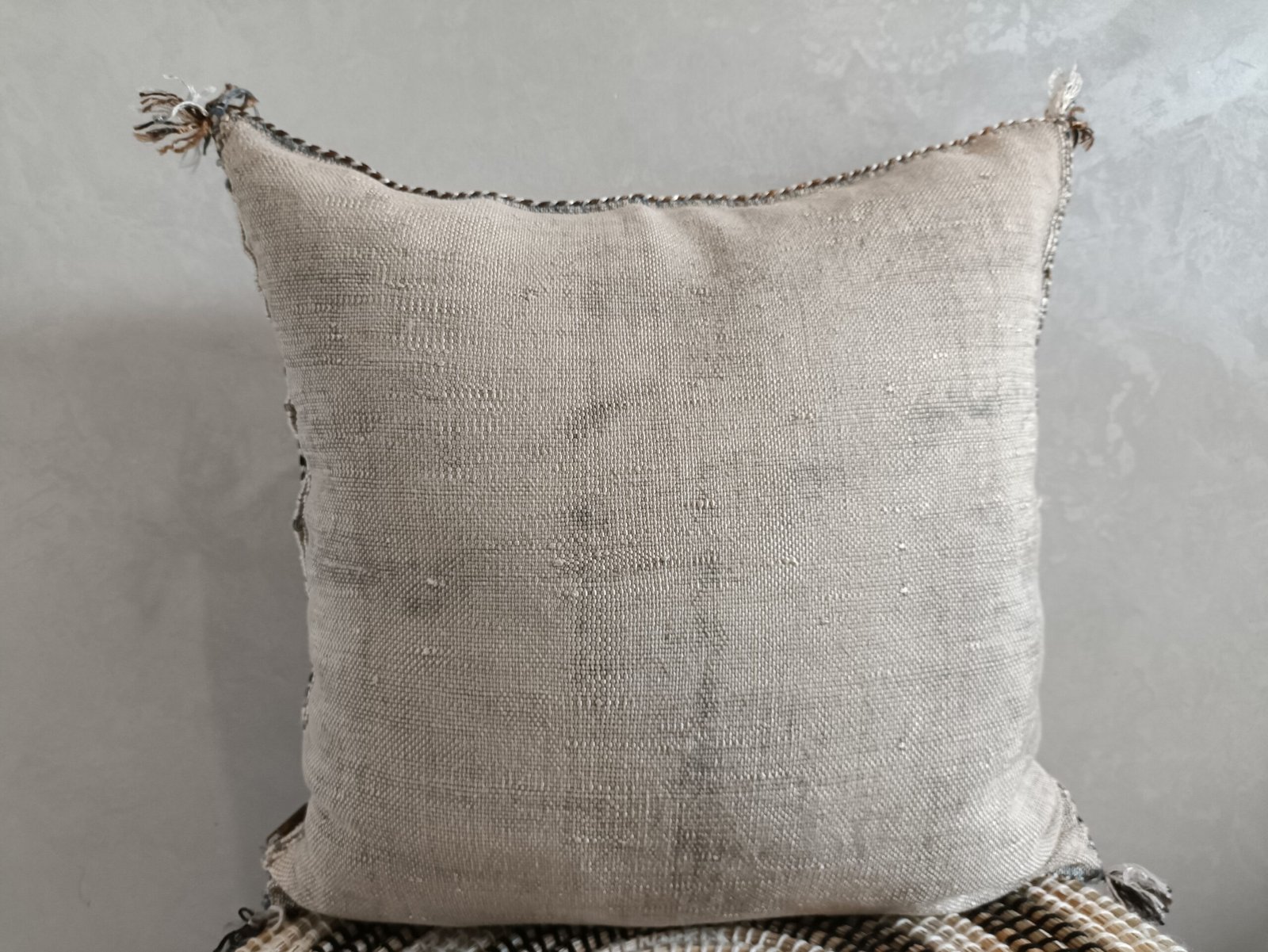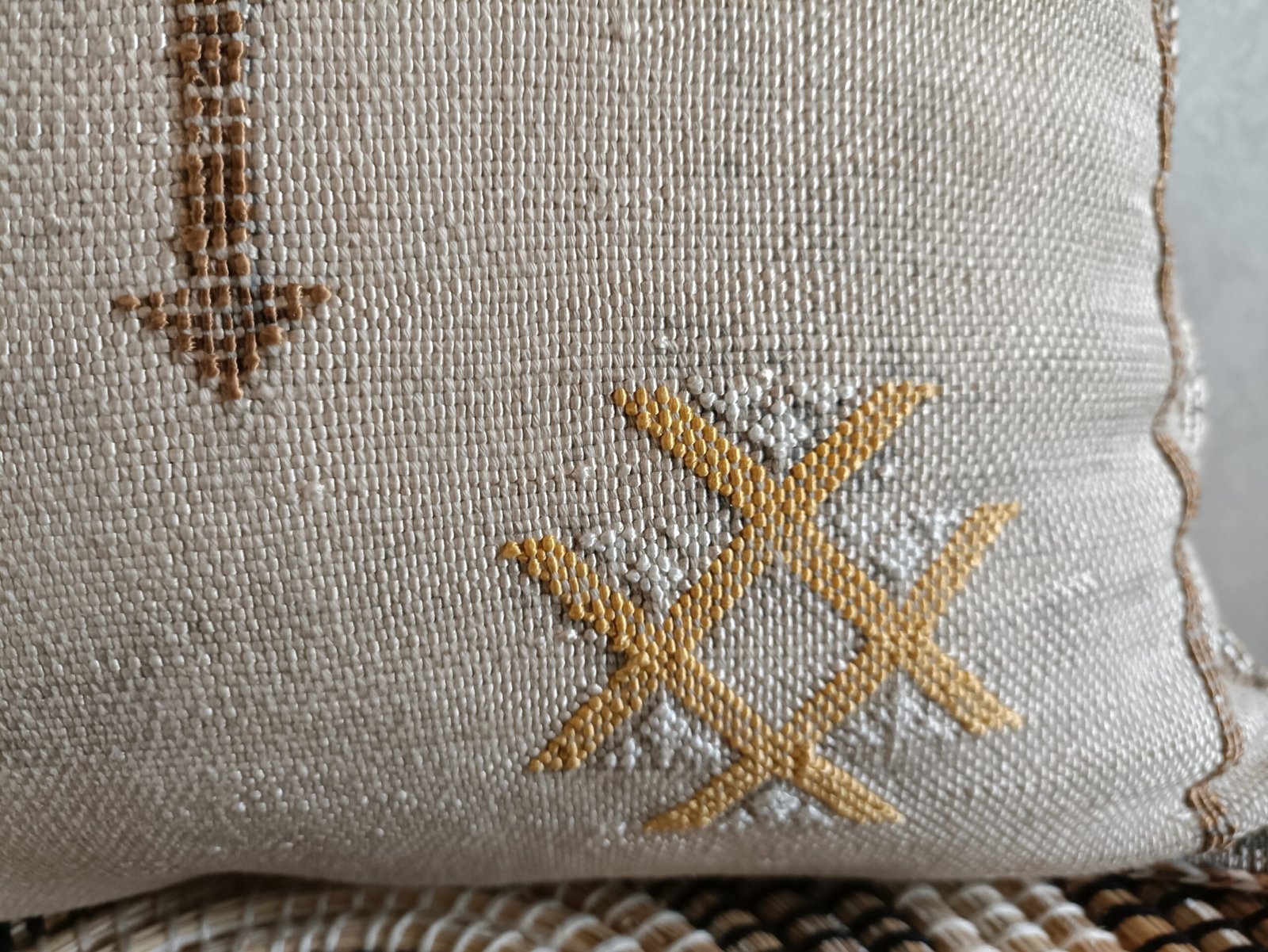 Authentic Moroccan Cactus Silk Pillow, hand woven by Berber women in their own homes. These skilled artisans will take at least a day to weave this pillow on traditional wooden looms, a craft that has been handed down from mother to daughter over many centuries. Following our own design, the motifs on the pillow cover reflect traditional symbols used by tribal women from Morocco’s Atlas Mountains.