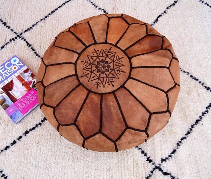 Our Moroccan Partner Artisansprovide us with leather ottomans of the highest quality. Handcrafted by the best craftsmen in Marrakech. Our Moroccan Ottoman is made of 100% high quality tanned goat leather colored with natural ingredients. This type of leather and treatment gives the pouf a sweet smell reminiscent of the merry scent of Berber souks, not as strong as the smell of Lamb Leather very often used for poor quality ottomans.
