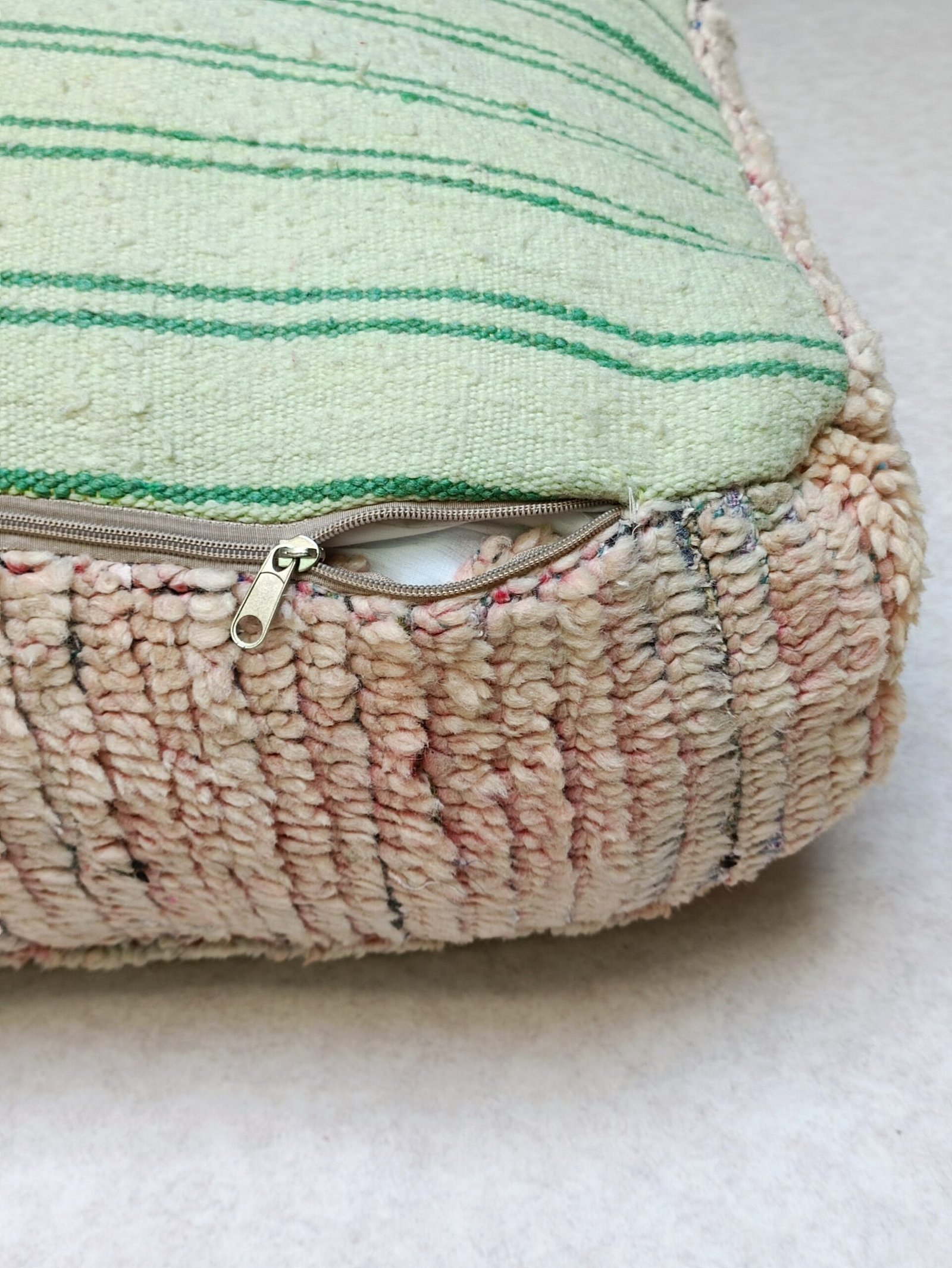 wool Pouf, handmade from old beni ouarain rug very resistant and very soft with a warm and elegant grain. All these features that make up wool make this pouf an exceptional interior and furnishing item.