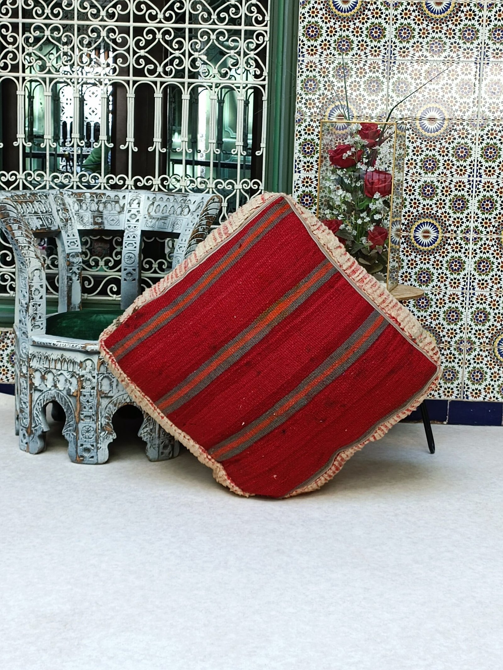Transform your living and leisure space into a lavish desert tent by setting up this beautiful floor pillow with a simple symbolic pattern on a tile or wooden floor or even Berber carpet and enjoy striking nomadic simplicity.