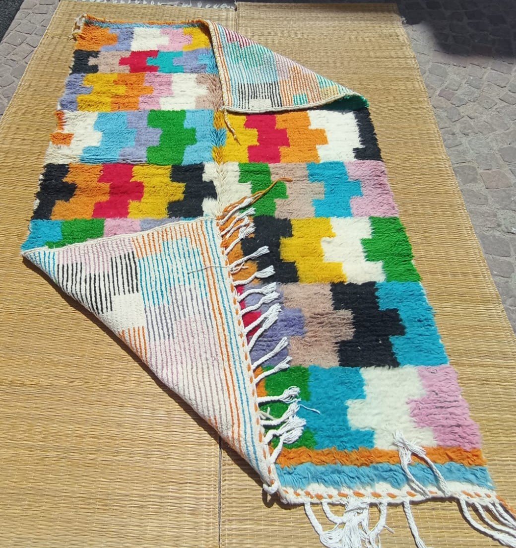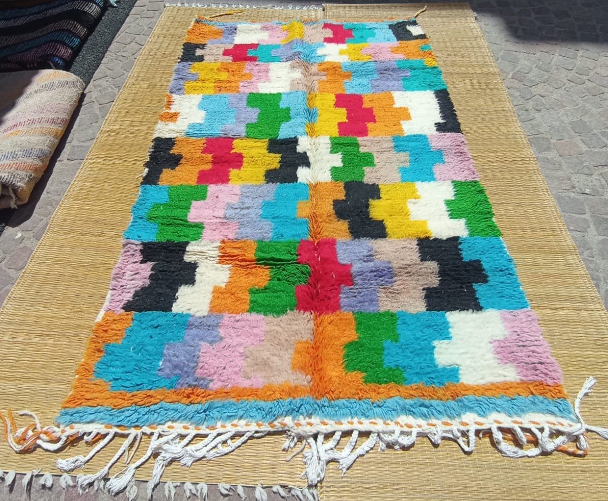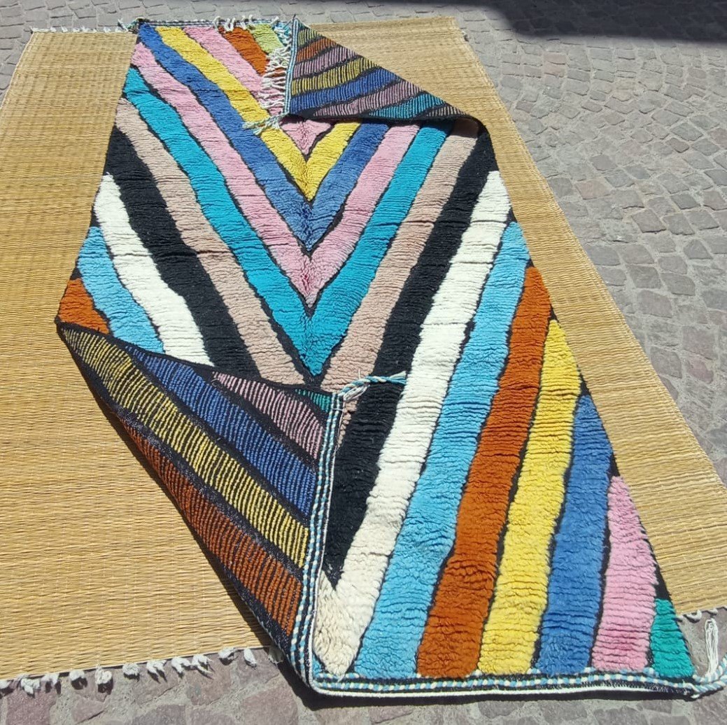 The mix of geometric shapes and expressive color makes it an ideal statement piece for contemporary spaces, adding warmth, texture, and personality. This authentic handmade Azilal rug is a beautiful fusion of Berber tradition and modern style.