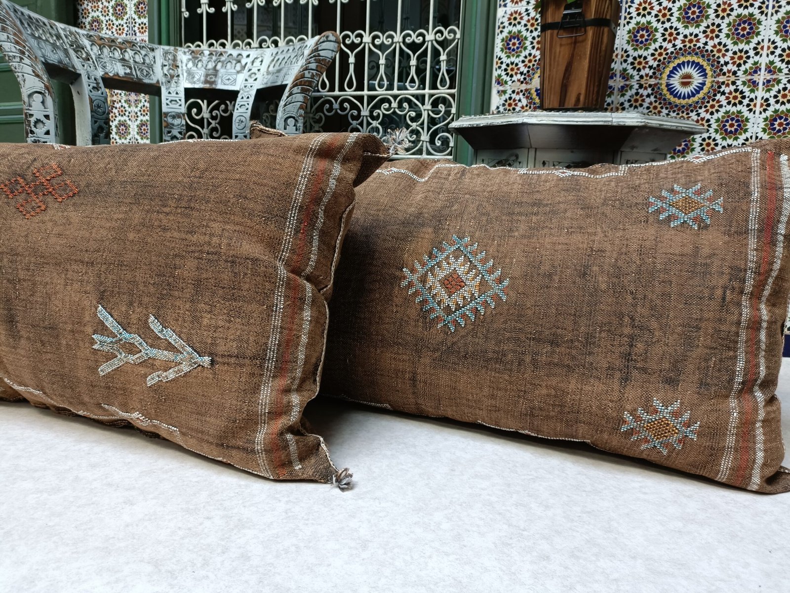 Our pillows are made from sabra. Handwoven by Berber women, the pillow cover reflects traditional symbols used by tribal women from Moroccan women.
