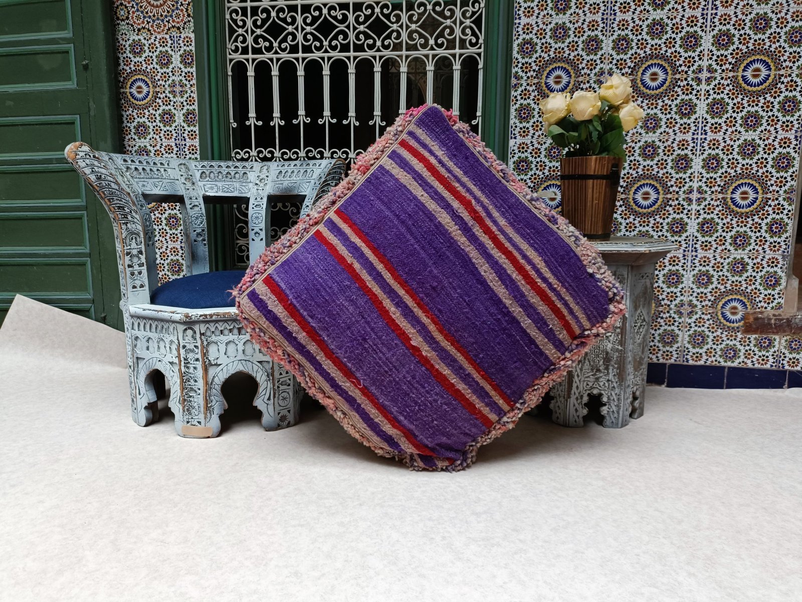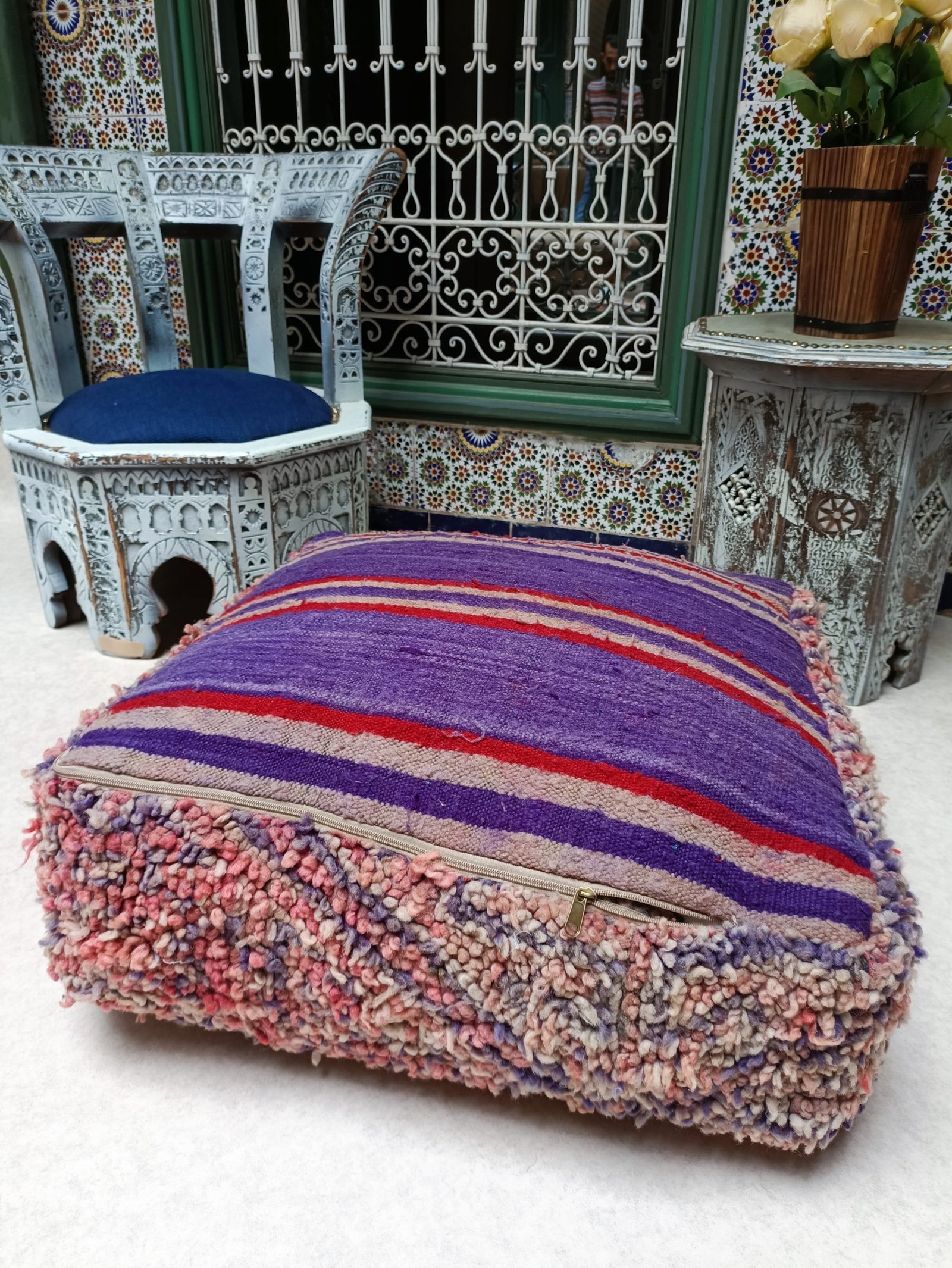 Moroccan Kilim Floor Cushion is multiple function, it can be used as an ottoman, footrest, yoga meditation cushion, or just a coffee table.