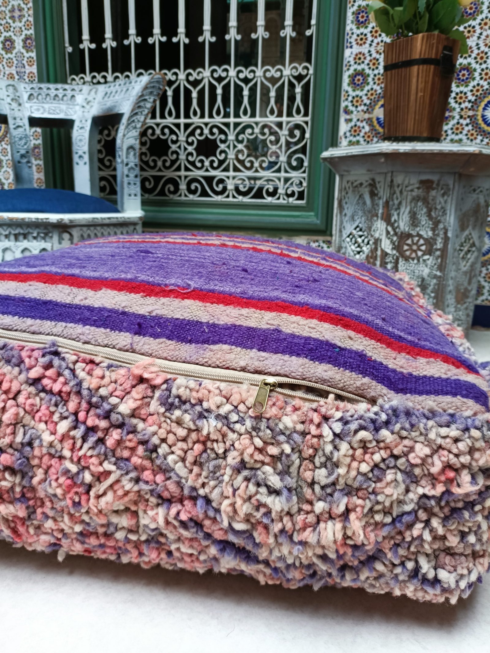 This one-of-a-kind Moroccan Pouf is handcrafted by Berber women using vintage kilim rugs from Morocco. Each Moroccan Pouf kilim is distinct and unique and with a Berber symbol, each symbol has a meaning that tells stories.