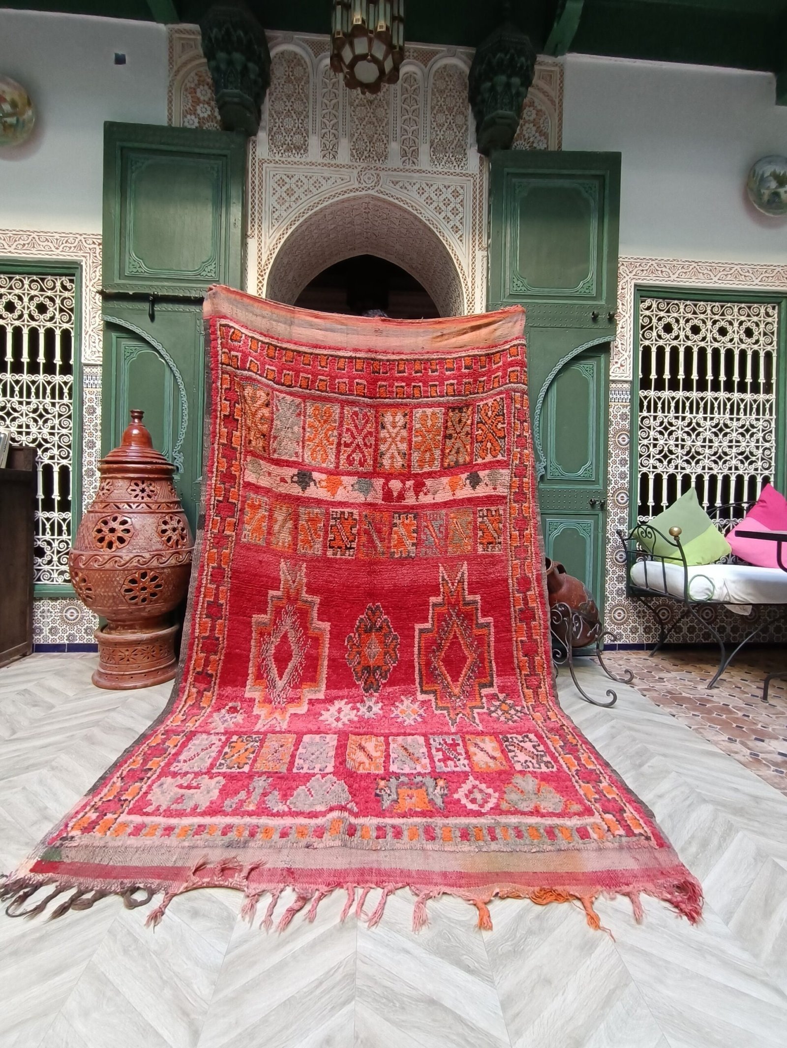 This vintage Moroccan rug are most famous for the dynamic color design and bold geometric pattern. this piece is a sliver of history, a slice of true folk art, and is an heirloom that may be passed down for generations.